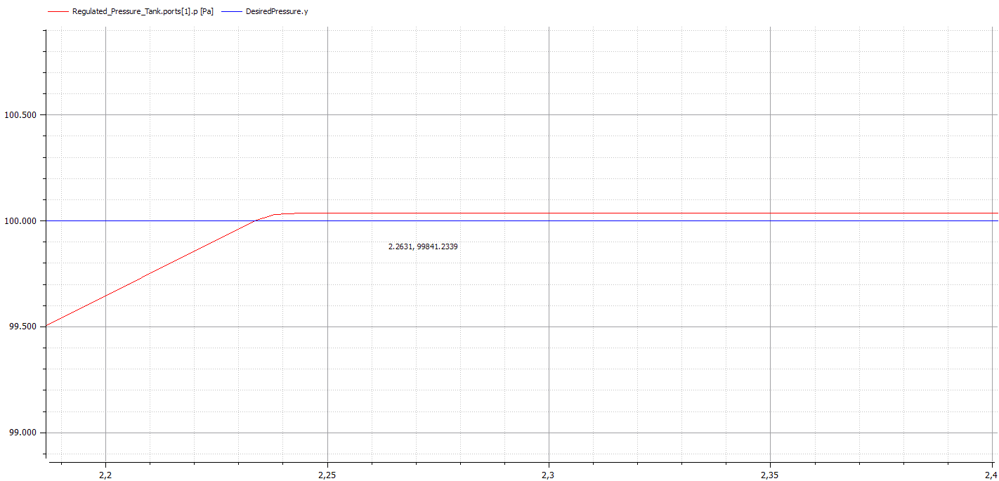 We were concerned about the performances of the valves that should be employed into the Pitot-Static calibrator. In particular we wanted to evaluate the behavior of a valve during transitions between two different pressures. As performance test we will simulate the valve behavior when it is used to regulate the pressure of a tank. That tank is the idealization of the pneumatic circuit volume from the pressure sensor to the static port. Simulation objective is to support the Pitot-Static calibrator pneumatic circuit design, in particular the selection of air volumes. The designer should be able to easily evaluate the use of different valves.
