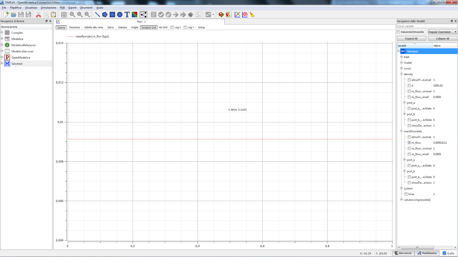 OpenModelica https://openmodelica.org/ has a built-in library for valves, hence I decided to simulate the regulated valve behavior using this software. At first I’ve setup a simulation to check the simulated value. You find here “valvetest.mo” file that was used for simulation; here below a figure of the simulation setup.